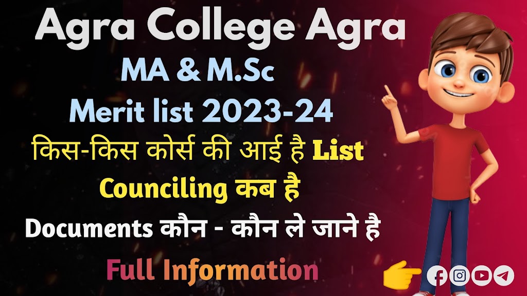 आगरा कॉलेज आगरा में MA & M. sc की Merit List जारी, जिन छात्रों ने आगरा कॉलेज आगरा में MA और M. Sc के लिए Apply क्या था उसकी merit list जारी हो गई हैं। counciling 20 नवम्बर 2023 को 11 से 3 बजे तक होगी सभी को समय से पहुँचना होगा जिससे आपको counciling समय से हो सके, मेरिट लिस्ट का चार्ट नीचे दे रखा आप अपने Cut off के माध्यम से कॉलेज जा सकते हैं और जिन छात्रों का Counciling में नाम आया है उनके पास कॉलेज की तरफ से MSG आया होगा अगर आपके पास नही आया है और आपका cut off में नाम है तो आप Counciling में जा सकते हैं। जिन छात्रों की Counciling होने वाली है उनको नीचे दिए गए Documents ले जाने है।