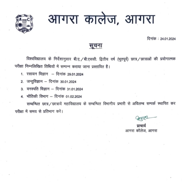 जो छात्र आगरा कॉलेज आगरा से कर रहे हैं उनकी date कॉलेज वालो ने Confirm कर दी है और कॉलेज की site पर देख सकते हैं और हमने नोटिस यह भी post कर दिया है इसके साथ आप हमारे Instagram, Telegram, whatsapp chennal से ले सकते हैं, सभी छात्रों से आग्रह है जल्दी से जल्दी आप कॉलेज में clear कर ले आपके प्रेक्टिकल कब होंगे।