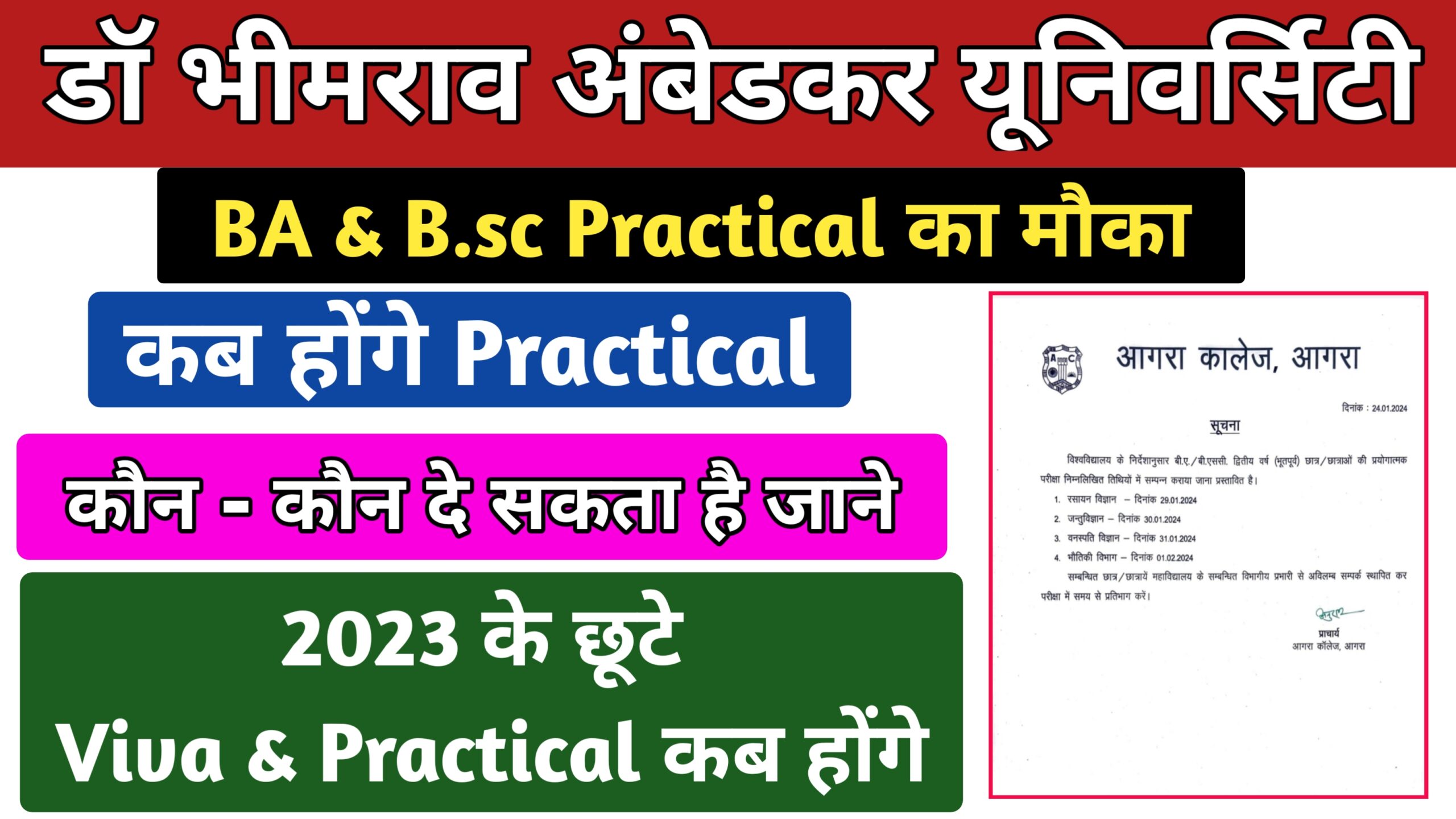 डॉ भीमराव अंबेडकर यूनिवर्सिटी के BA & B.sc के भूतपूर्व छात्रों को प्रेक्टिकल देना का मौका दिया सभी छात्र अपने अपने कॉलेज में सम्पर्क करें जिससे फिर से आपके प्रेक्टिकल की date निकल न जाये क्यो की अब date निकल गई फिर पता नहीं कब date आयेगी।