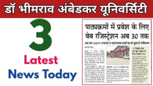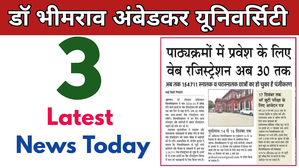 आगरा। डॉ. भीमराव आंबेडकर विश्वविद्यालय ने सत्र 2023-24 में प्रवेश लेने वाले छात्रों के वेब रजिस्ट्रेशन की तारीख एक बार फिर से बढ़ा दी है। अब 30 नवंबर तक छात्र-छात्राएं बेब रजिस्ट्रेशन करा सकेंगे। विश्वविद्यालय में हर दिन छात्र रजिस्ट्रार और कॉलेजों में जाकर रजिस्ट्रेशन बढ़ाने की मांग कर रहे थे।