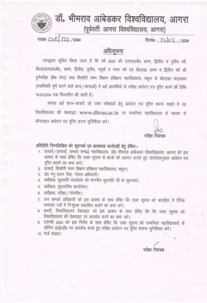 Dbrau वर्ष 2023 की एलएल०बी० प्रथम, द्वितीय व तृतीय वर्ष, बी०ए०एलएल०बी०, प्रथम, द्वितीय, तृतीय, चतुर्थ व पंचम वर्ष एवं बी०एड० प्रथम व द्वित्तीय वर्ष की पुर्नपरीक्षा (बैक पेपर) तथा किशोरी रमण शिक्षण प्रशिक्षण महाविद्यालय, मथुरा के बी०एड० पाठ्यक्रम (उपास्थिति पूर्ण करने वाले छात्र/छात्राओं) में अहं अभ्यर्थियों के परीक्षा आवेदन पत्र पूरित करने की तिथि 16.03.2024 तक विस्तारित की जाती है।