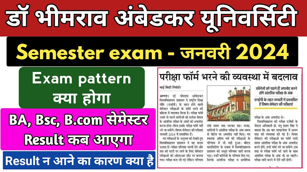 हलो दोस्तो जो छात्र डॉ भीमराव अंबेडकर यूनिवर्सिटी से BA, B.sc, B.com, MA, Msc, Mcom सेमेस्टर में है उनके exam जनवरी 2024 में शुरू होने जा रहे हैं, साथ ही यूनिवर्सिटी ने बताया है इनके exam Pattern OMR होगा, जो यूनिवर्सिटी ने पहले भी clear कर दिया था इसका कारण है सत्र को जल्दी ही पटरी पर लाना, अभी भी semester students का Results जारी नही हुआ है उसके बारे में भी यूनिवर्सिटी ने बताया है कि क्या कारण है जो आप नीचे दिए गए लेख में अच्छे से पढ़ सकते हैं।