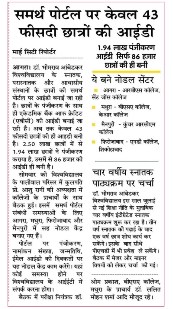 डॉ. भीमराव आंबेडकर विश्वविद्यालय के स्नातक, परास्नातक और आवासीय संस्थानों के छात्रों की समर्थ पोर्टल पर आईडी बनाई जा रही है। छात्रों के पंजीकरण के साथ ही एकेडमिक बैंक आफ क्रेडिट (एबीसी) की आईडी बनाई जा रही है। अब तक केवल 43 फीसदी छात्रों की ही आइडी बनी है। 2.50 लाख छात्रों में से 1.94 लाख छात्रों ने पंजीकरण कराया है, उसमें से 86 हजार की आईडी ही बनी है।