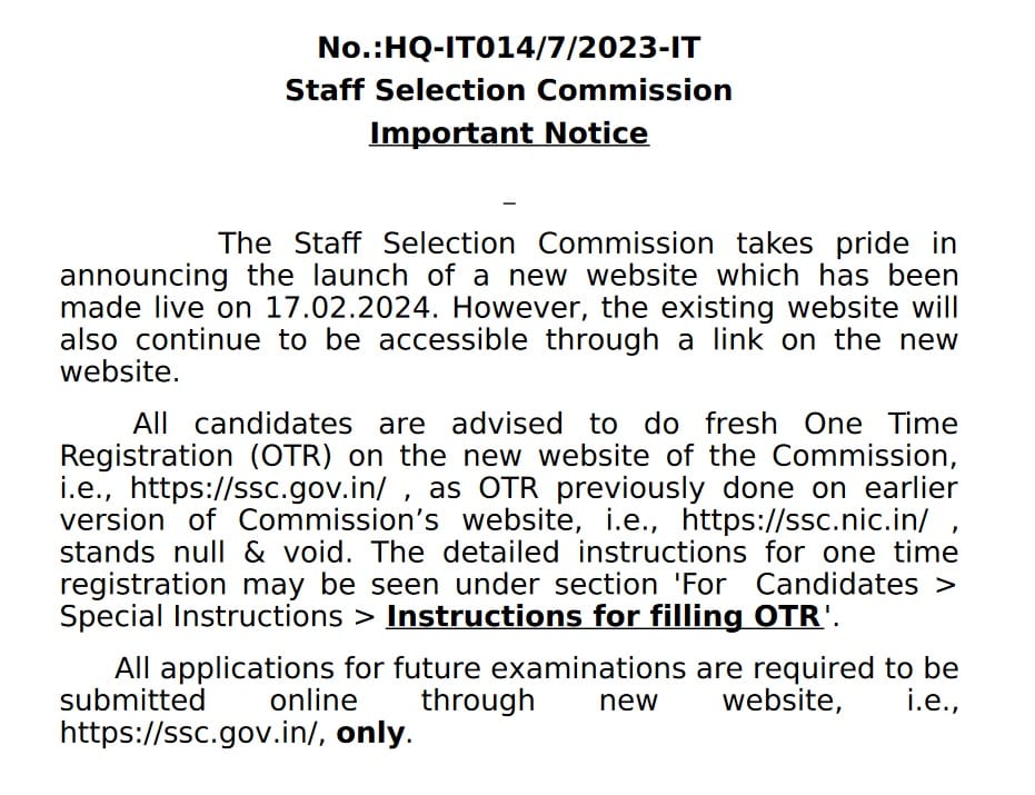 SSC की नई वेबसाइट पर सभी को Fresh OTR One Time Registration करना होगा नोटिस जारी