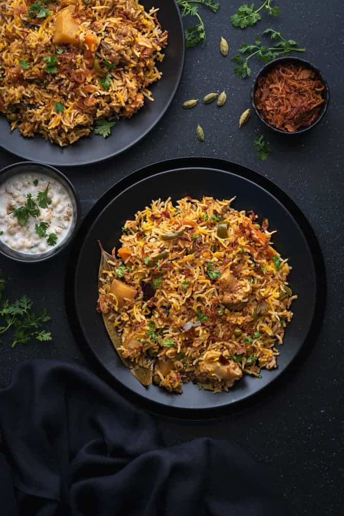 वेज बिरयानी में मीठे, तीखे और तुरंत पकने वाले मसालों का संतुलित मिश्रण शामिल होता है, जो इस व्यंजन को अनूठा और विशेष बनाता है।”
